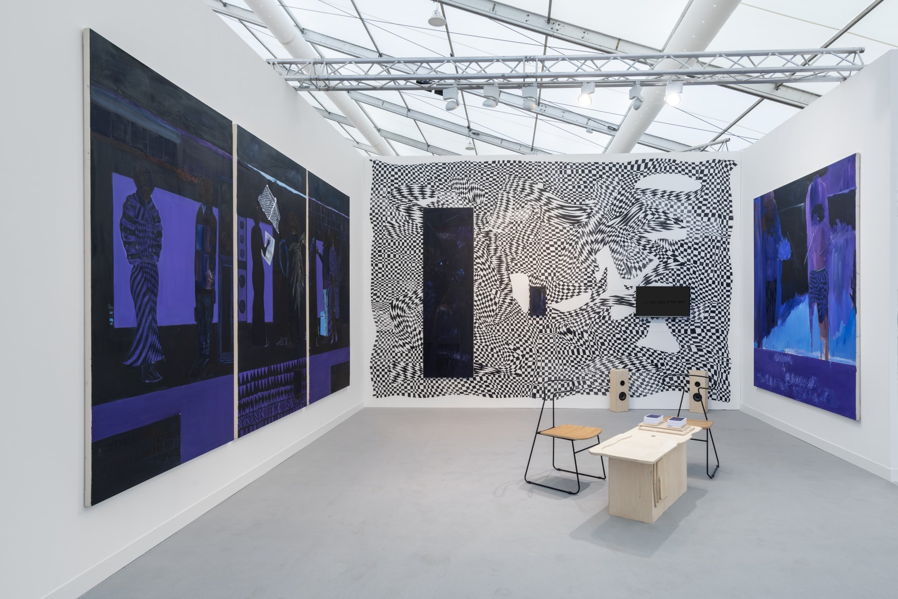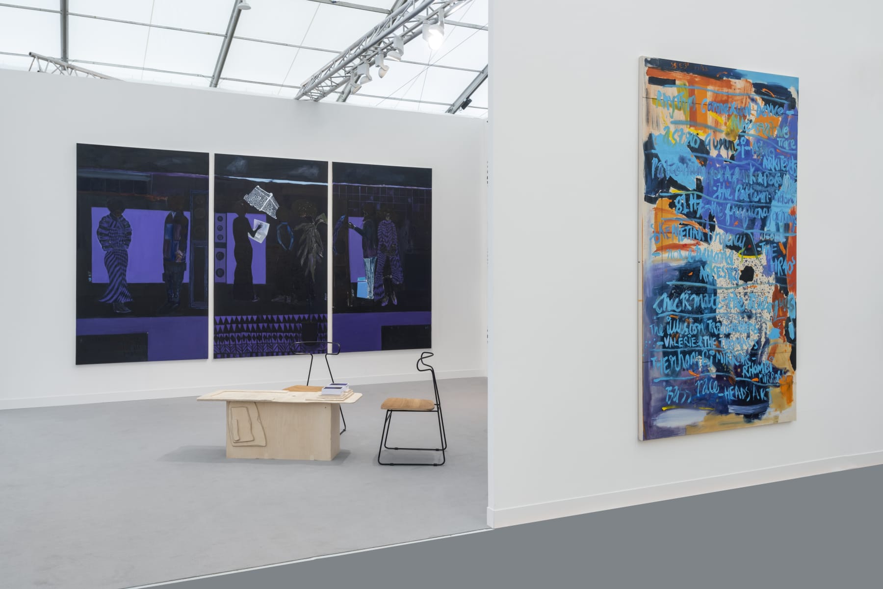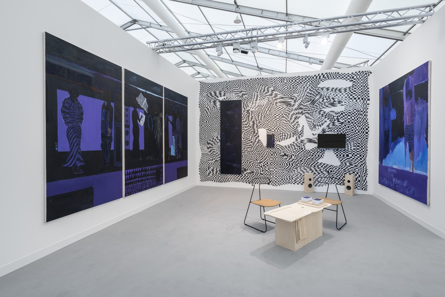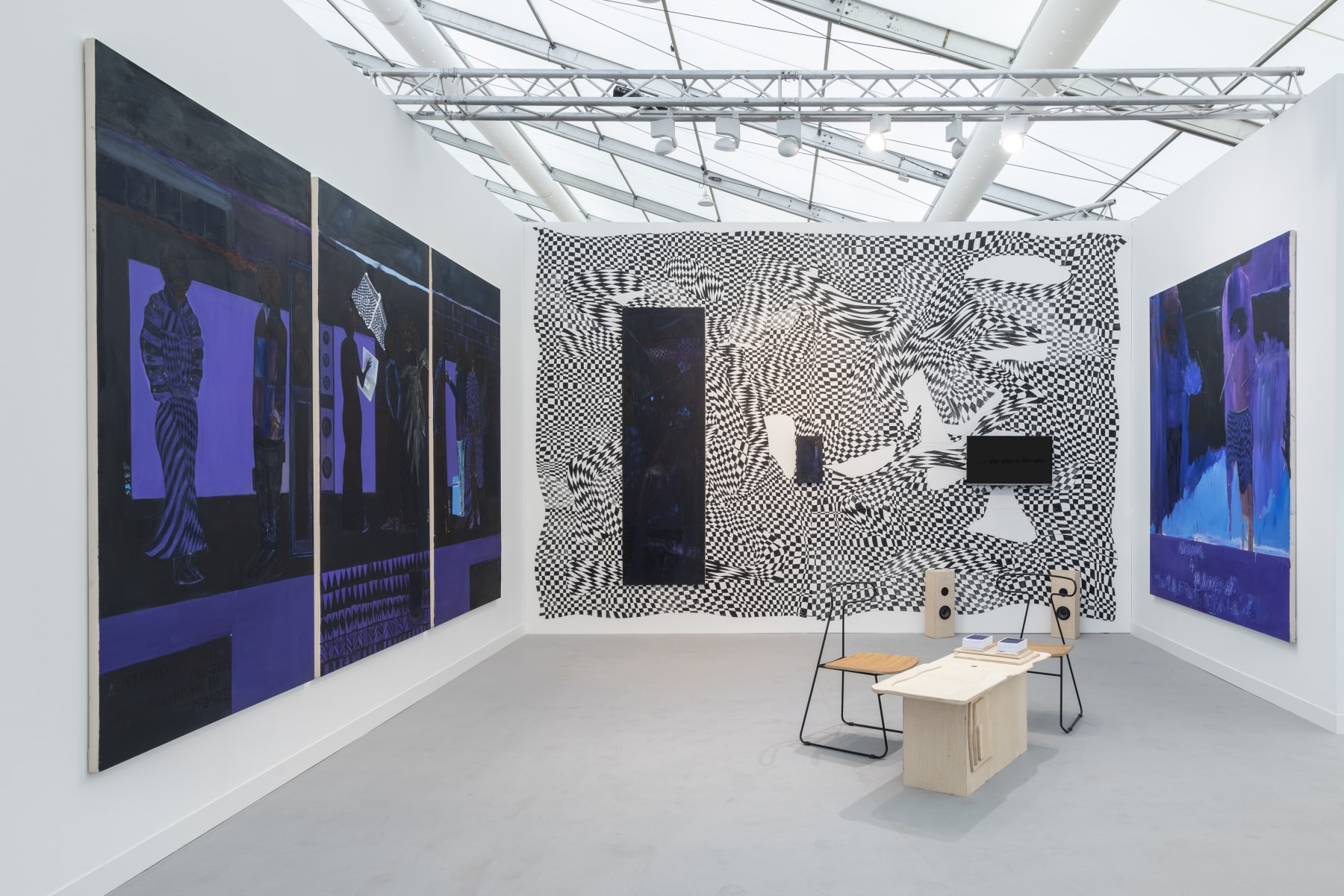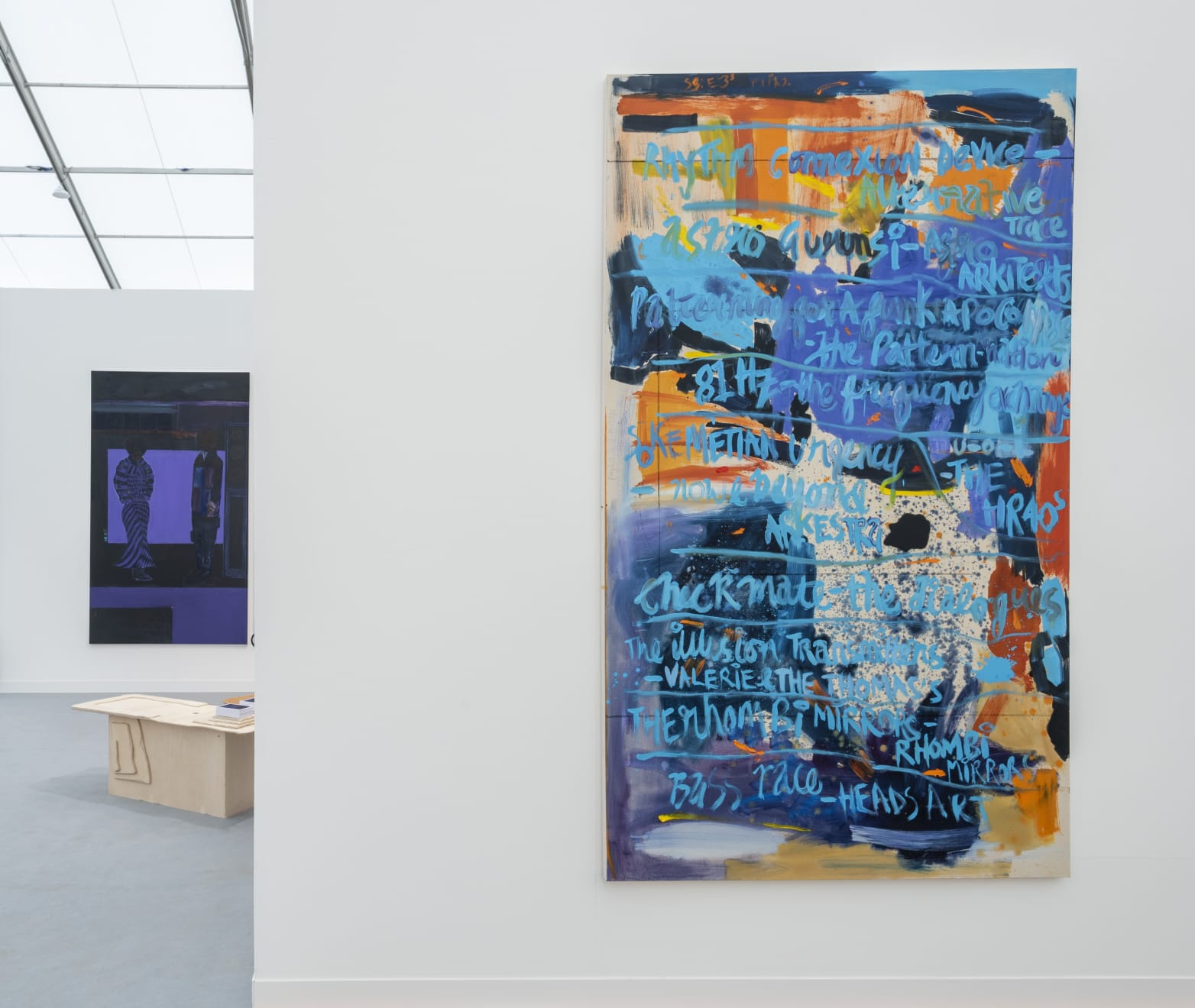 For Frieze London 2021, the artist will mount a site-specific installation, part multisensory experiment and part gesamtkunstwerk, that theatricalises a concern fundamental to his practice: the symbiotic relationship between painting and sound. Alongside a suite of new and unseen paintings, the artist will also present a soundscape (a frequently seen feature of Hart’s practice). Titled Alter-Native Trace S3:E3s and lasting 45mins, it encompasses found sound, sound experimentation and electronics including saxophone by acclaimed British musician Shabaka Hutchings and Blue Cloud (with whom the artist connected with online). In addition, the presentation of a ‘digital poem’ at the booth emerges out of Hart’s ongoing explorations of word, text, and language.