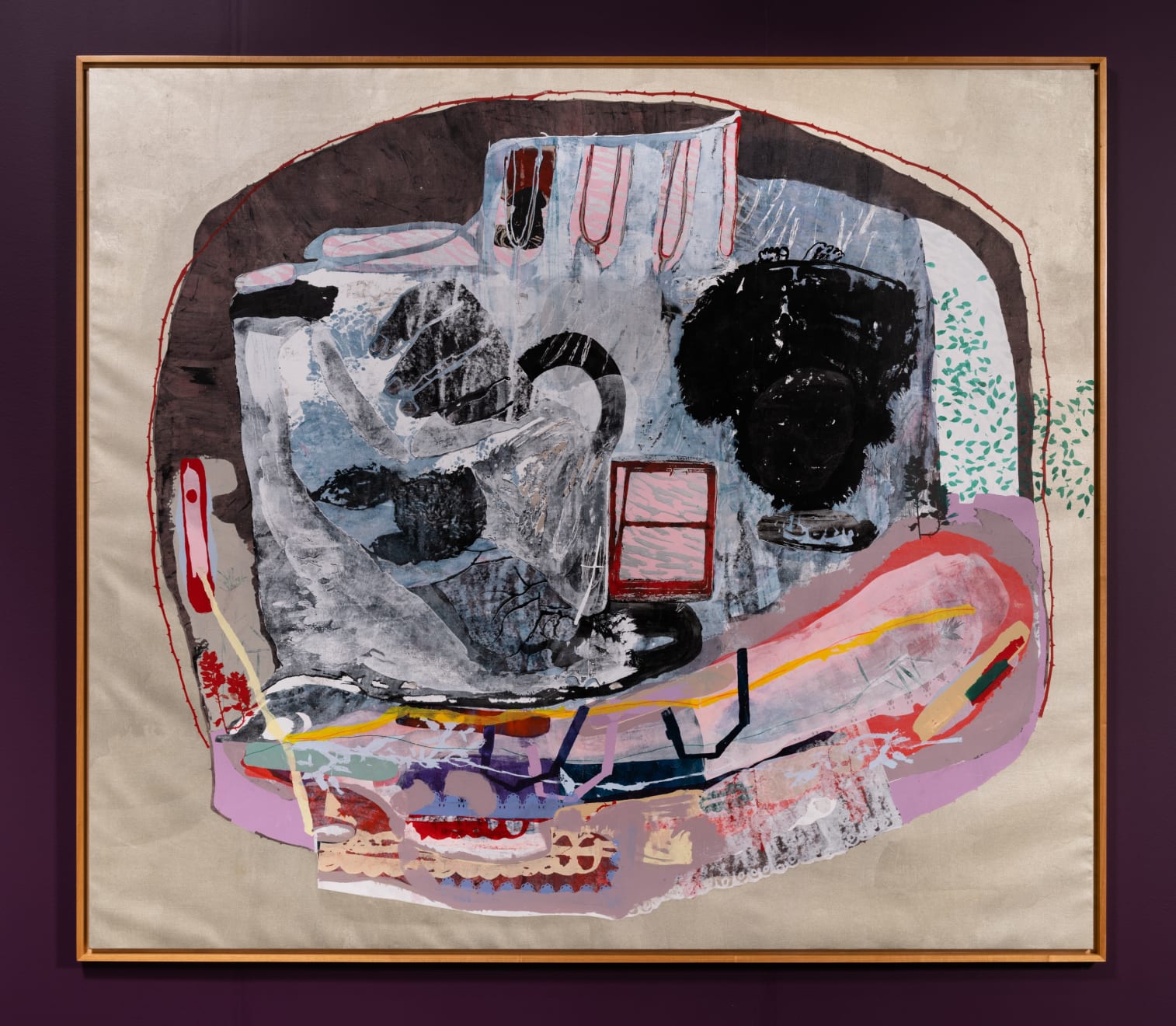 Alicia Henry deploys pattern-cutting techniques to produce multiple, mixed-media elements from recycled fabric, leather, painted wood and paper to configure wall-based compositions that starkly contemplate the dynamics of the social milieu that the individual or community body finds itself relating or in isolation to.